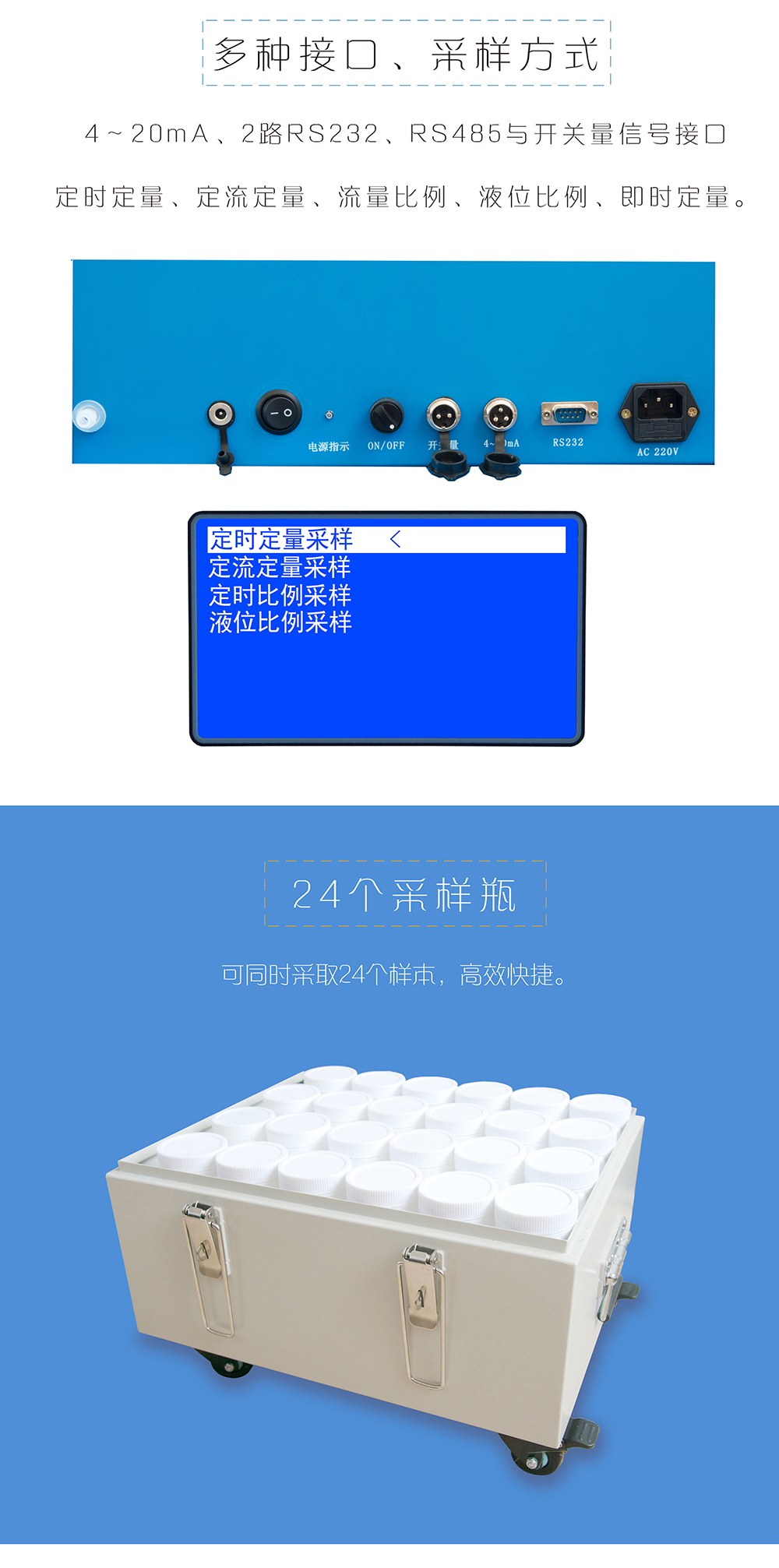 2.多種采樣功能:定時定量采樣、定流定量采樣、流量比例采樣、液位比例采樣、即時定量采樣。