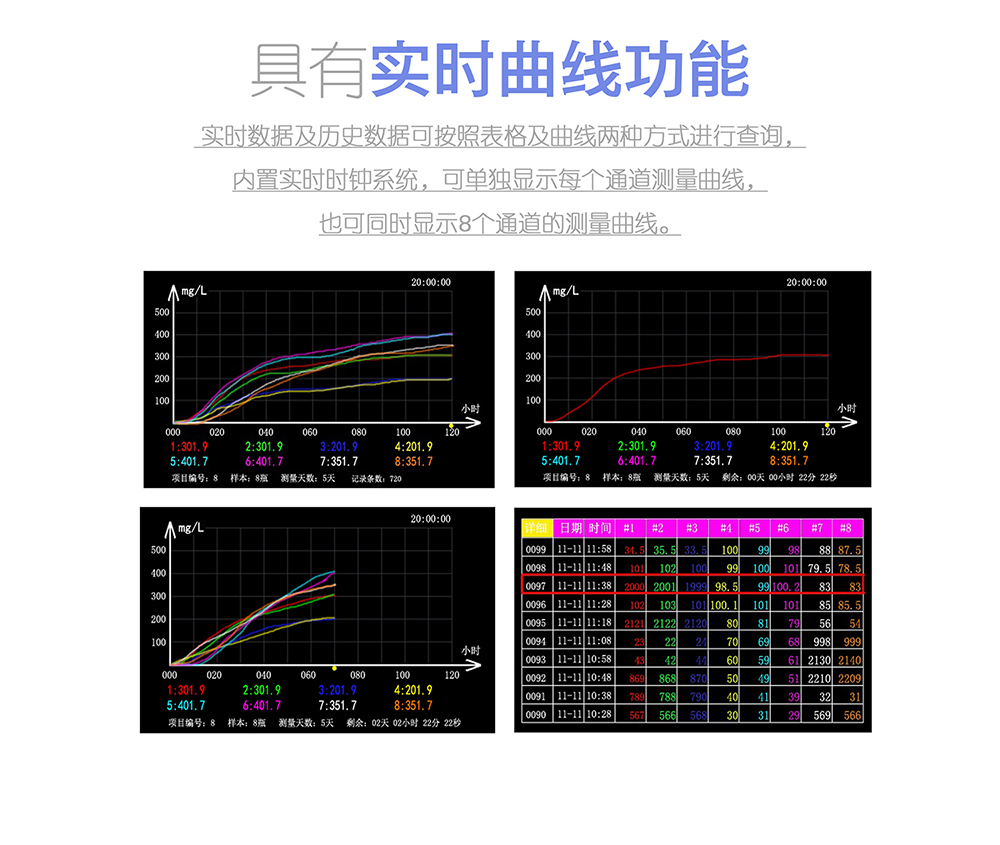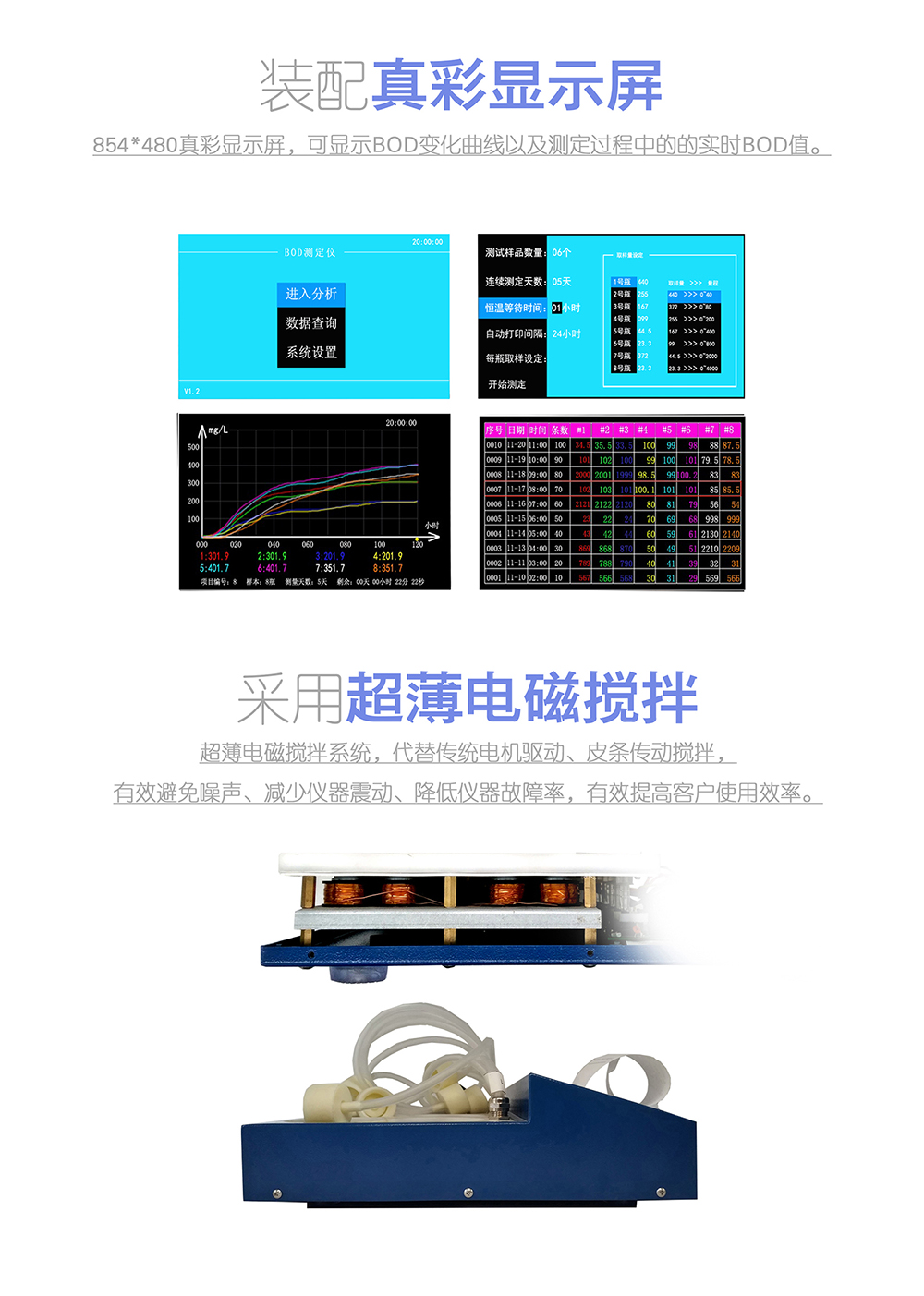 2、 真彩顯示屏,可顯示BOD變化曲線以及測定過程中的的實時BOD值。
