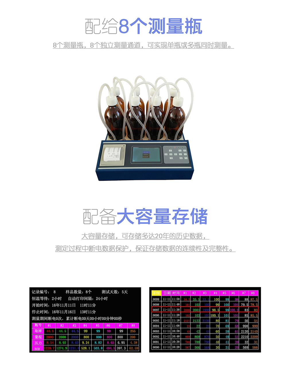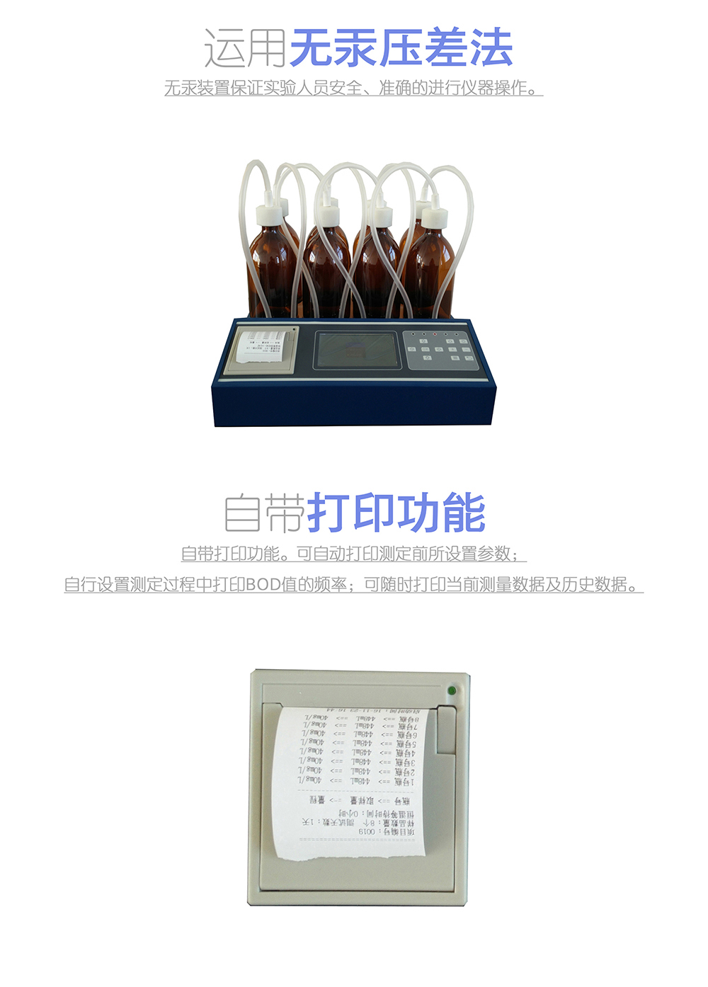 3、 自帶打印功能。可自動打印測定前所設置參數;自行設置測定過程中打印BOD值的頻率;可隨時打印當前測量數據及歷史數據。