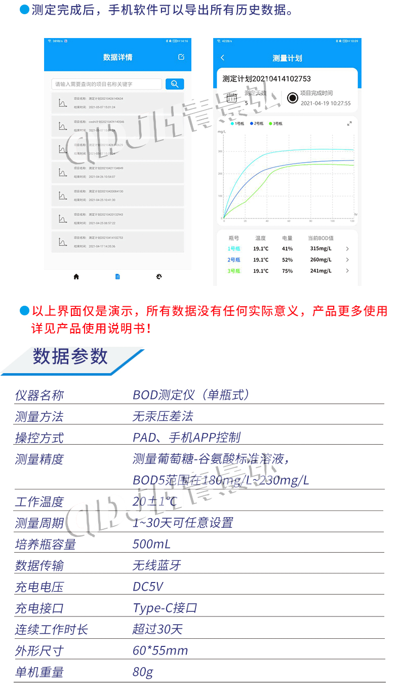 JH-801型BOD測定儀是根據(jù)國標(biāo)《HJ505-2009 水質(zhì) 五日生化需氧量(BOD5)的測定 稀釋與接種法》規(guī)定,模擬自然界中有機(jī)物的生物降解過程,采用簡單、安全、可靠的無汞壓差感測法測量水質(zhì)BOD值。儀器采用智能測控技術(shù),測量全過程通過手機(jī)APP進(jìn)行控制、查看,無線數(shù)據(jù)傳輸,可實(shí)現(xiàn)多組設(shè)備的自動重連匹配,方便實(shí)時查看測定數(shù)據(jù)結(jié)果。可廣泛適用于環(huán)境監(jiān)測站、第三方檢測機(jī)構(gòu)、科研、高校以及污水排放企業(yè)等。