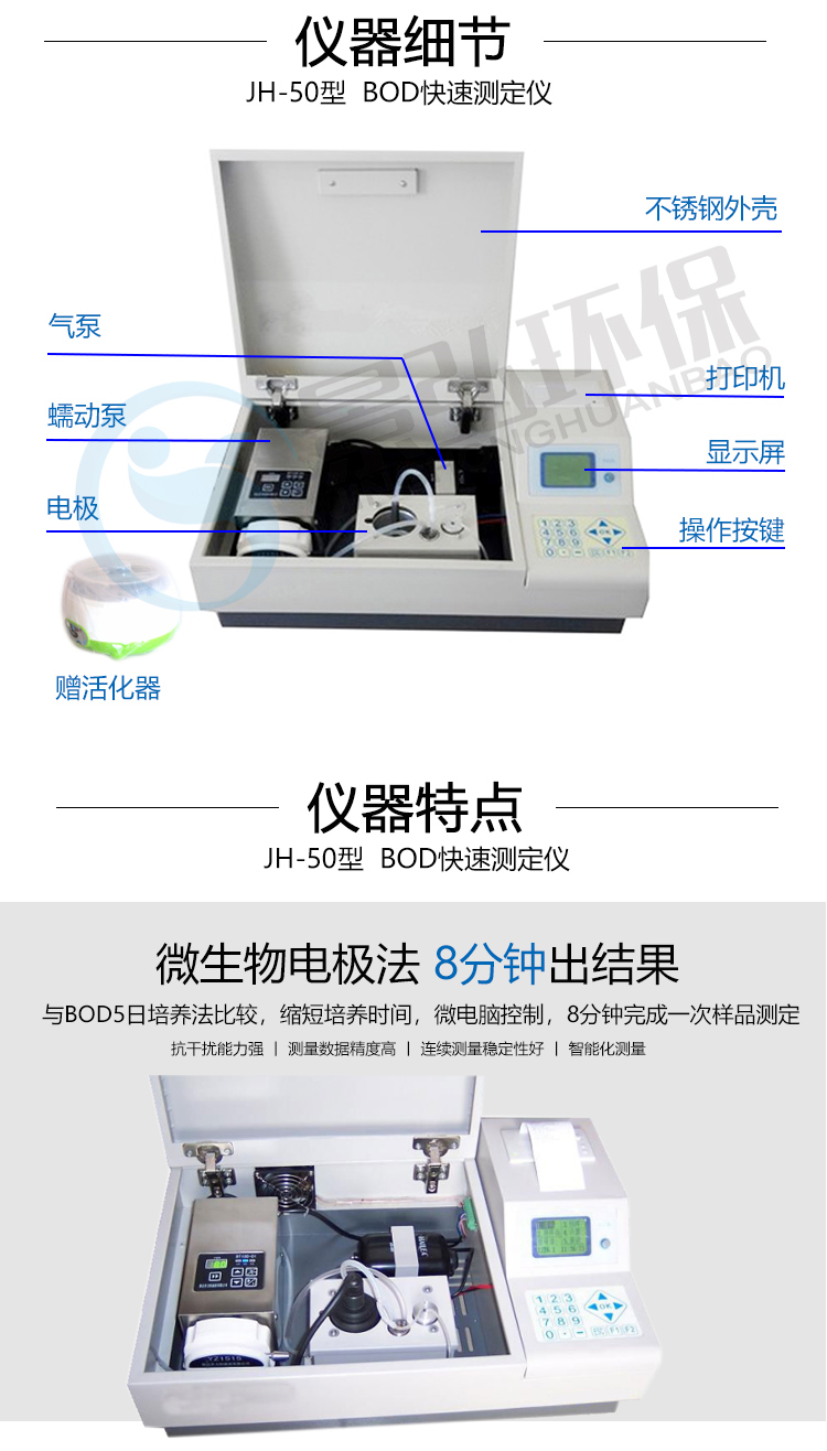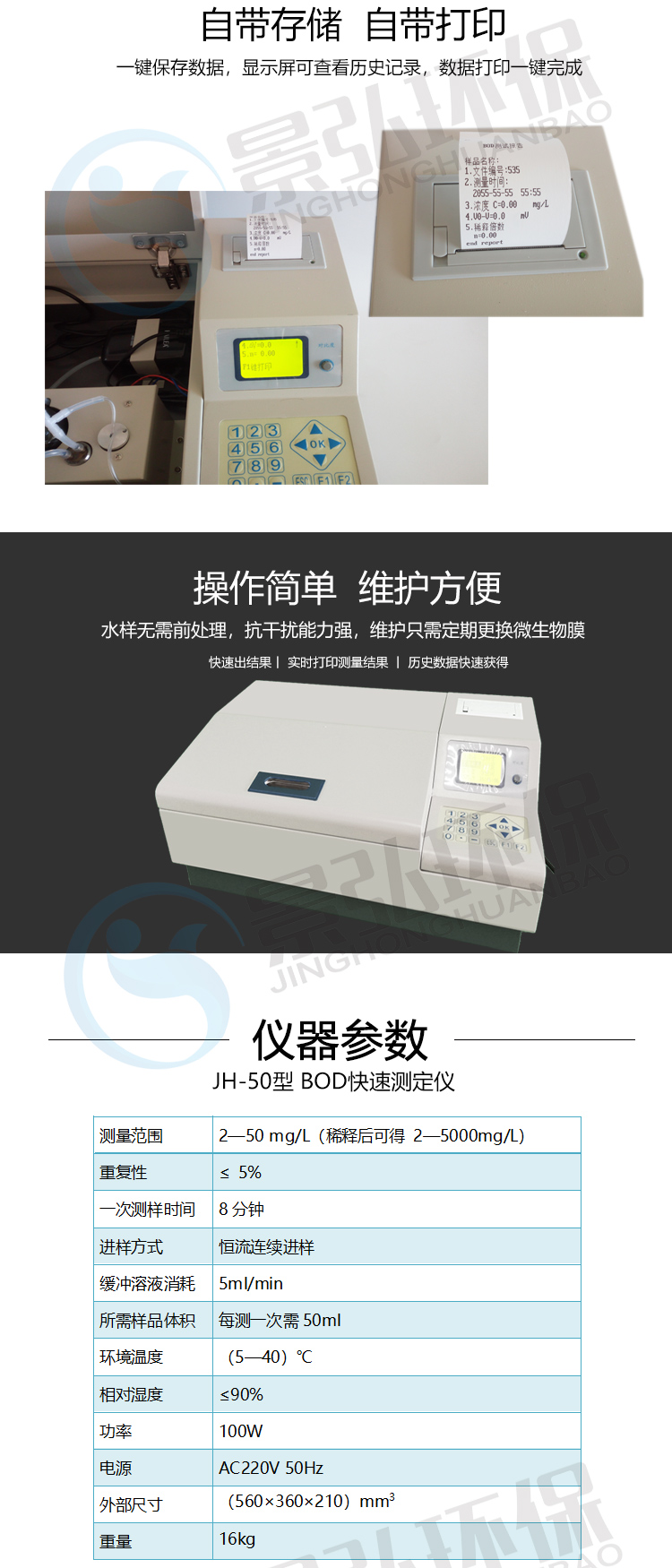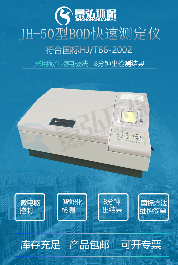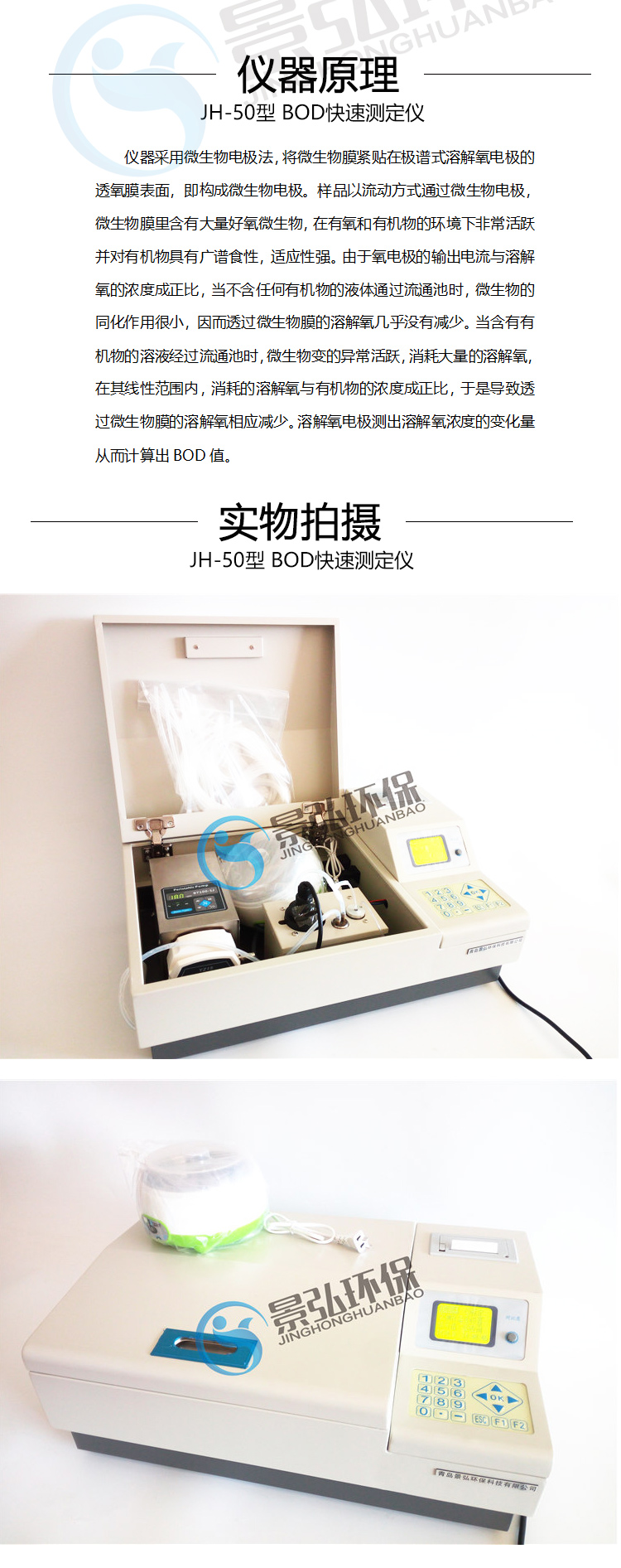 JH-50型BOD快速測定儀采用微生物電*法,能快速測定水樣中的BOD值,而且操作簡便,測量準確。其原理基于微生物對有機物的耗氧代謝,測定BOD只涉及到初始氧化速率,因而可在8-15分鐘內完成一個樣品的測定。大大縮短了測定所需的時間。該方法符合《水質生化需氧量(BOD)微生物傳感器快速測定法》(HJ/T86-2002),在2002年出版發行的《水和廢水檢測分析方法》(第四版)列為A類方法。